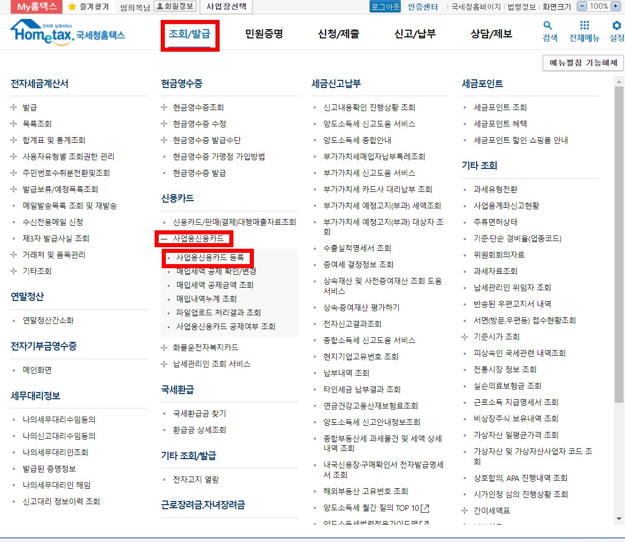 아래 사진과 같이 국세청 홈택스에 로그인 후 "조회/발급 > 신용카드 > 사업용신용카드 > 사업용신용카드 등록" 메뉴에 들어가시면 등록이 가능합니다.